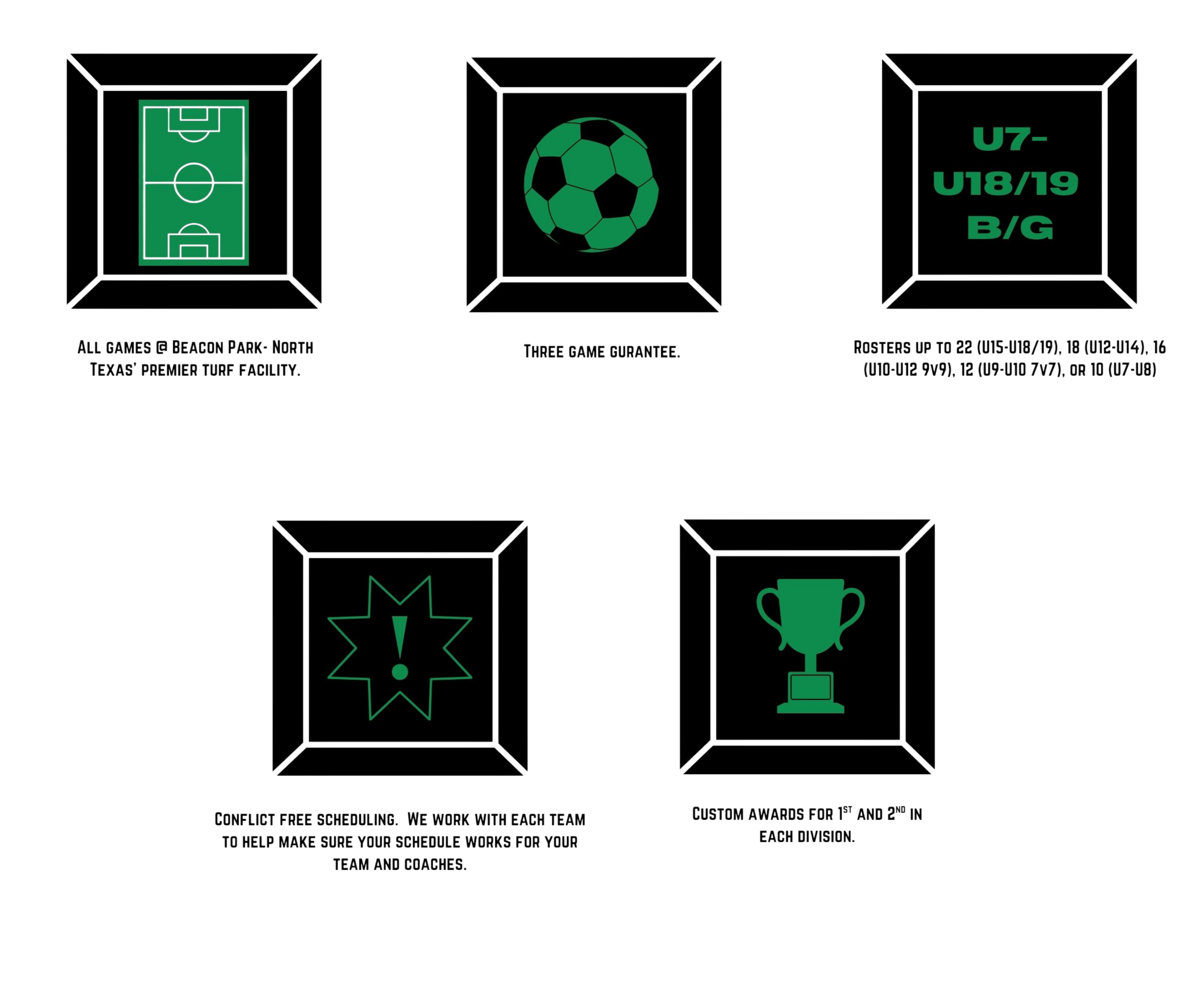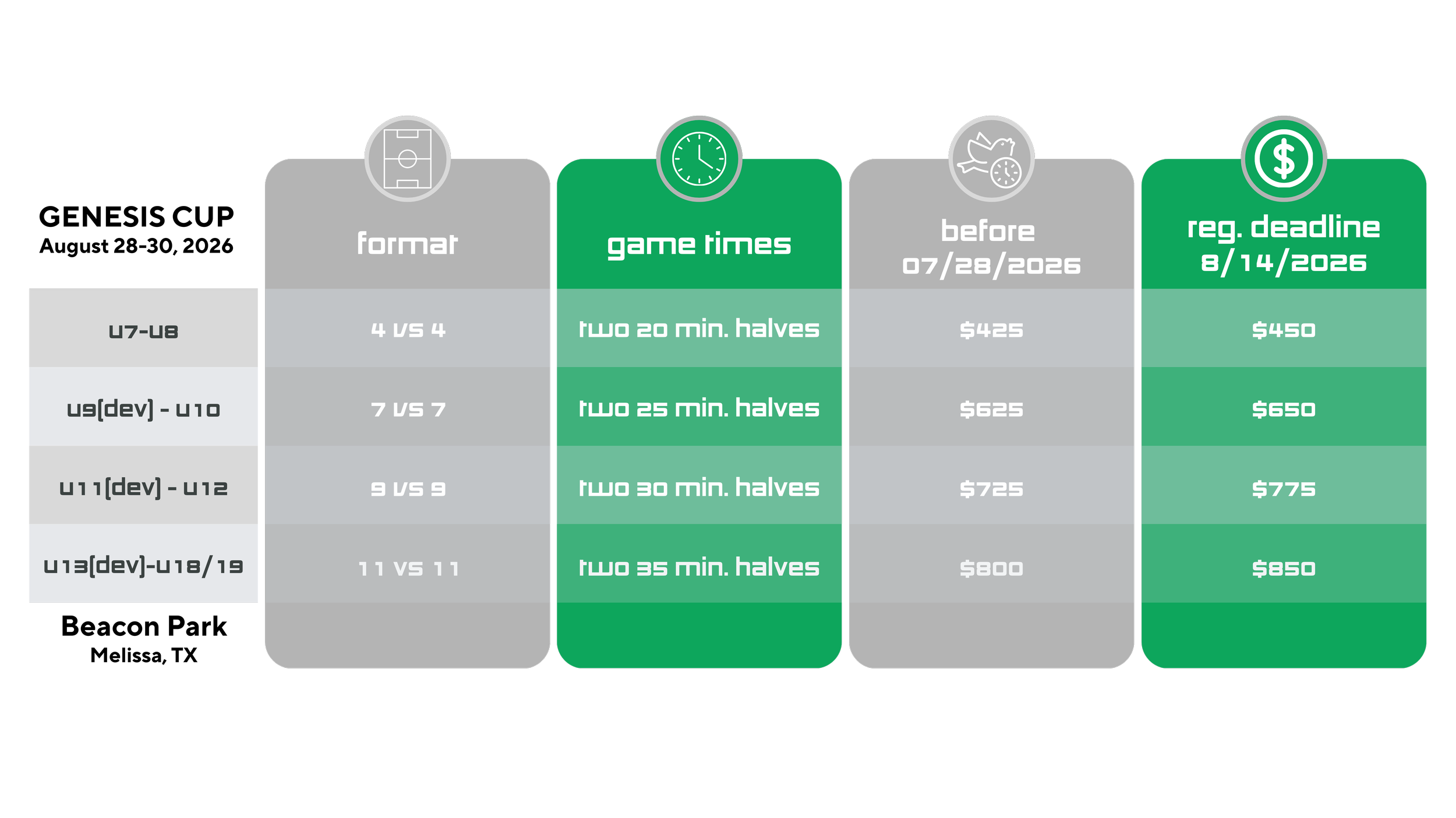 Kick off fall 2026 at Genesis Cup. Playing August 28-30, 2026 at the world-class Beacon Park, the largest turf facility in the state of Texas! Enjoy a 3-game guarantee, home/away tents & benches, conflict-free scheduling, and custom awards for 1st & 2nd in every division. Bring your full squad—rosters up to 22 (U15-U18/19), 18 (U12-U14), 16 (U10-U12 9v9), 12 (U9-U10 7v7), or 10 (U7-U8)